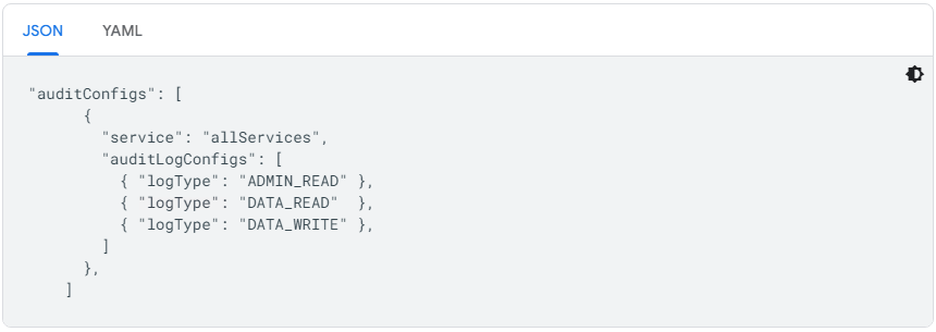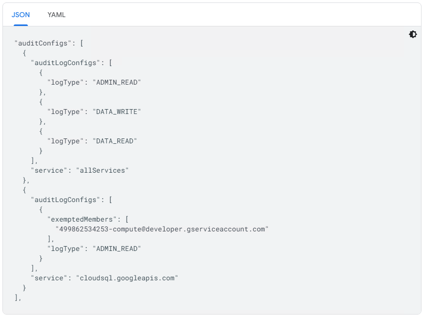 以下是 JSON 和 YAML 格式的审核配置示例。YAML 格式是使用 Google Cloud CLI 时的默认格式。