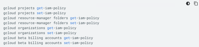 您可以使用 Resource Manager API getIamPolicy 和 setIamPolicy 方法来读取和写入 IAM 政策。我们提供多种特定方法供您选择: