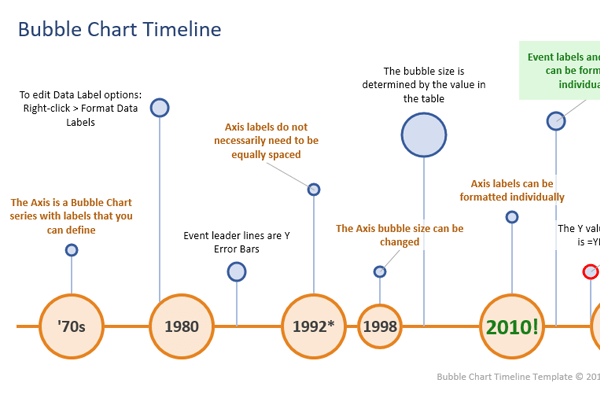 使用此模板为您的项目创建时间表。使用较小的气泡添加各种分支和信息,同时使用主时间轴创建大型概览。