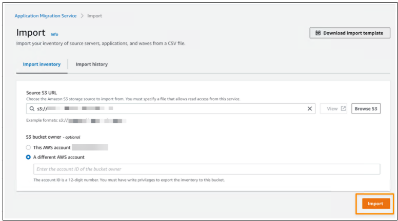 下一步是将我的 CSV 文件上传到 Amazon Simple Storage Service (Amazon S3) 存储桶。然后,我可以通过引用包含我已上传到 S3 存储桶的库存列表的 CSV 文件,从应用程序迁移服务控制台开始导入过程。