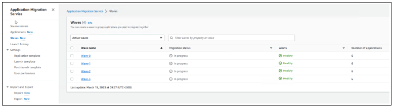 现在,我可以在应用程序迁移服务控制台的源服务器、应用程序和Waves页面中查看我的所有清单。以下是最近导入的 wave 的截图。