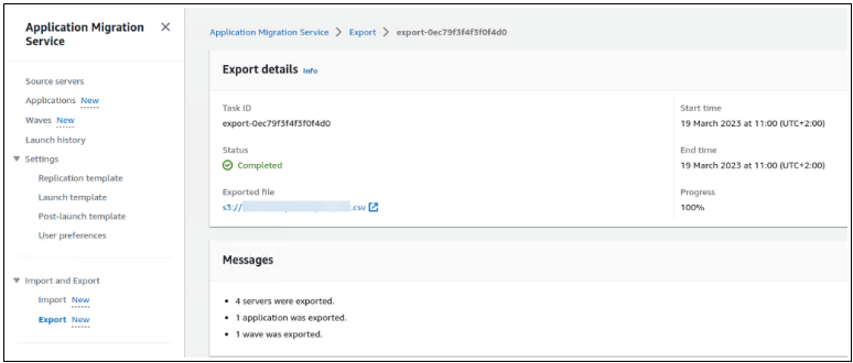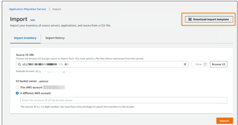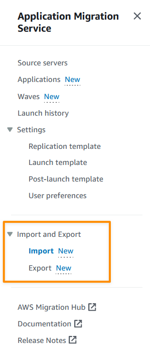 导入和导出– 您现在可以使用应用程序迁移服务将源环境清单列表从 CSV 文件导入到服务中。您还可以导出源服务器清单以用于报告目的、离线审查和更新、与其他工具和 AWS 服务的集成,以及通过重新导入清单列表来执行批量配置更改。