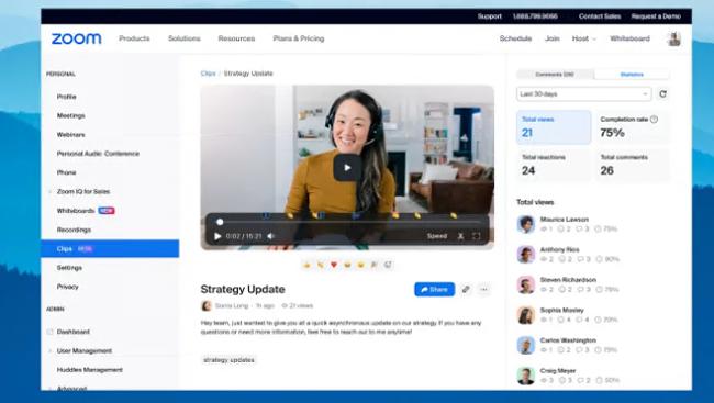 通过剪辑录制剪辑后,用户可以添加标题、描述和标签;修剪不需要的部分;并通过 Zoom 门户网站的电子邮件分享录音。从同一门户,他们可以控制谁可以查看该剪辑(例如,具有链接的任何人或仅组织中的人员),并查看评论和指标,例如完成率和观看次数。