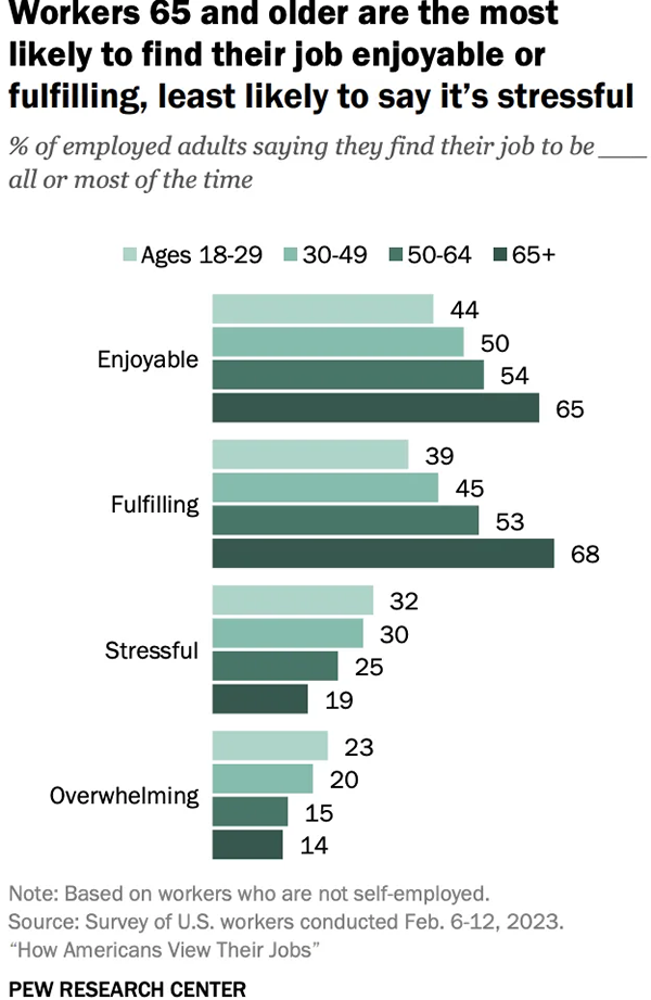 “虽然他们只占劳动力的一小部分 (7%),但年长的员工对他们的整体工作和工作的各个方面最满意,例如他们与同事和经理的关系,”皮尤研究中心社会趋势研究主任金帕克告诉雅虎财经。“与年轻员工相比,他们也更有可能发现工作令人愉快和充实,并且不太可能感到压力大或不知所措。”