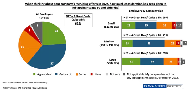 根据调查,71% 的中型公司和 69% 的大型公司表示对 50 岁以上的求职者给予了“很多”或“相当多”的考虑,高于 58% 的小型公司。