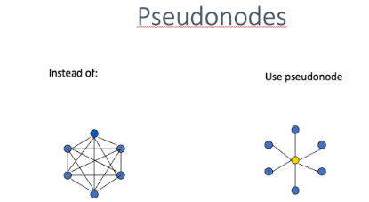 根据 Perlman 的说法,她编写的路由算法应该适用于任何底层协议,而不仅仅是 IP 或DECNet。当以太网发挥作用时,她需要将节点集成到一个网络中。如果她考虑了算法中的每个节点组合,她最终会得到 n*n 的节点组合,这会大大增加查找数据库的大小。相反,她考虑了“伪节点”方法,这意味着只有 n+1 个节点,如下图所示。