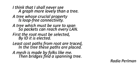 网桥只是混杂地听,并在“以太”空闲时转发到其他端口[...]这需要没有循环的拓扑,生成树算法的最初目的是拥有一个可扩展的、高效的算法(无论节点数量如何,它都需要相同数量的内存)来识别无环路拓扑。由于设计算法所需的时间远远少于她手头的时间,而且她的主管正在休假且无法访问,她写了一个“算法押韵”作为她研究论文的摘要。