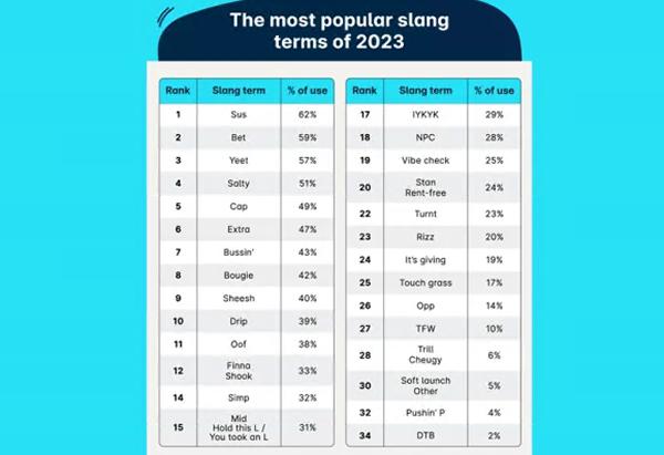 大多数父母都会听到一些俚语。大多数人表示他们知道“salty”(70%)、“bougie”(67%)、“sus”(65%)、“bet”(63%)和“extra”(62%)的含义。他们可能也熟悉滴灌,因为它是今年第十个最流行的俚语。