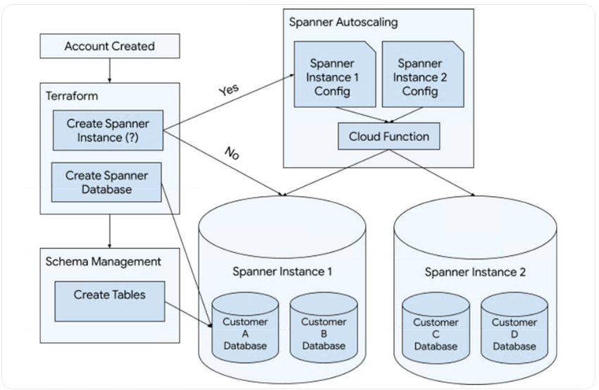 在 Kochava,我们要求每个客户的数据存储在他们自己的数据库中。为实现这一点,我们在配置 Kochava 客户帐户时自动创建 Spanner 资源。创建帐户后,我们会寻找一个现有的 Spanner 实例,其中包含另一个数据库的空间。如果一个不可用,我们将创建一个新的 Spanner 实例。当我们创建一个新的 Spanner 实例时,我们还会创建自动缩放资源和特定于帐户的服务帐户来访问数据库。