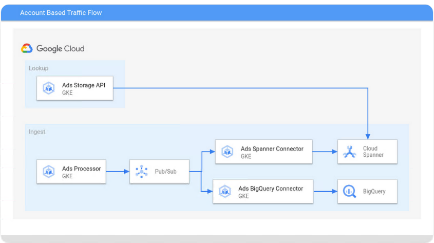 创建帐户及其对应的 Spanner 资源后,就可以摄取和处理数据了。广告信号数据针对每个帐户进行实时处理,并存储在 Cloud Spanner 中用于实时归因,存储在 BigQuery 中用于报告。其他需要为事件归因查找实时广告信号数据的系统通过 Ads Storage API 在 Cloud Spanner 上进行实时读取。