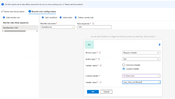 通过应用程序网关中的 OCSP 支持,用户可以让它向后端应用程序服务器发送客户端证书,以防它需要客户端证书信息用于审计目的,或者可能想要向客户端证书颁发令牌或 cookie。为此,用户可以设置重写规则以将客户端证书作为 HTTPS 标头发送。