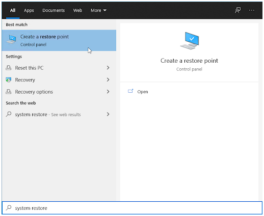 在搜索栏中,输入系统还原。从结果中选择创建还原点选项。