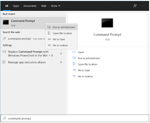 在任务栏内的搜索栏中键入命令提示符。从结果中右键单击它,然后选择以管理员身份运行选项。