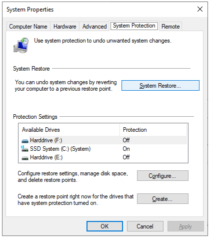 系统属性 窗口将启动。在这里,如图所示切换到“系统保护”选项卡。