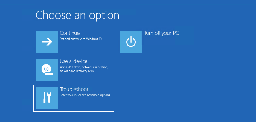 现在你在 winRE 中,在“ 选择一个选项” 屏幕上,选择 “疑难解答” > “高级选项” > “启动修复” > “重新启动” 。