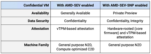 为了帮助您在机密 VM 之间进行选择,下面是一个比较图表: