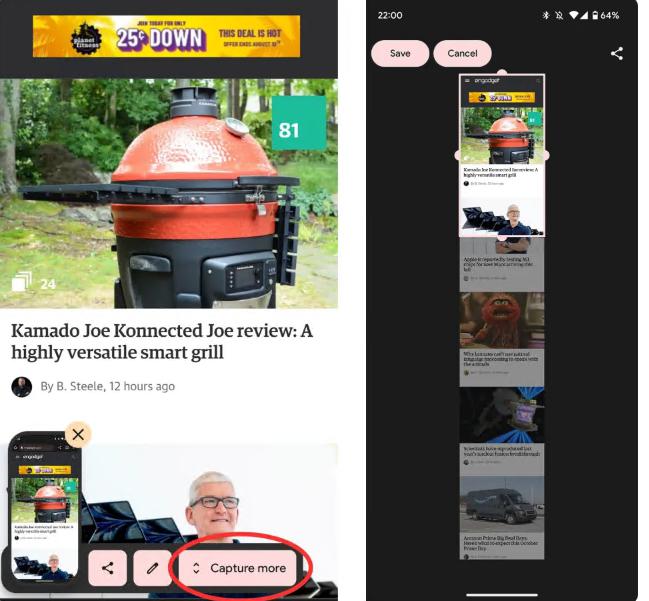 在 Google 设备上,您可以选择“捕获更多”。在三星手机上,会有一个向下的箭头。当您点击它时,您将获得整个页面的预览,您可以在其中调整边缘以包含您想要的内容。