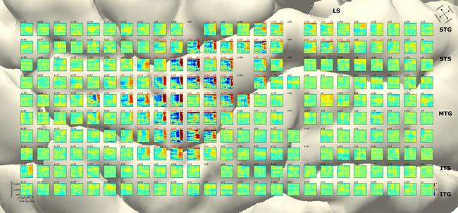 通过在 29 名受试者的大脑表面植入传感器,研究人员能够通过诸如此类的颜色编码图表分析电极反应数据,从而推断出他们向实验受试者播放的歌曲的部分和元素