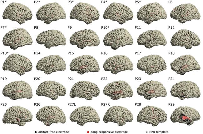 神经科学家将电传感器连接到 29 名癫痫患者的大脑表面,以研究他们对听觉刺激的反应。以下是传感器的位置,其中红点表示电极,其大脑区域记录了响应听到音乐的神经活动