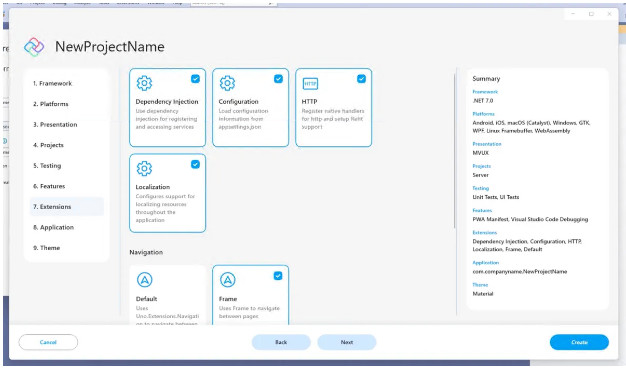Uno Platform 4.8 版本的一大亮点是全新的启动体验,它简化了创建新项目的过程。新的 App Template Wizard 允许开发人员在空白或默认模板之间进行选择,并根据他们的特定需求对其进行自定义。这包括能够选择他们喜欢的框架,选择他们希望开发的目标平台,并决定是使用 MVVM 还是 MVUX 设计模式。此外,开发人员可以选择单元或 UI 测试,并从一系列 Uno 扩展和主题中进行选择,以进一步定制他们的应用程序。