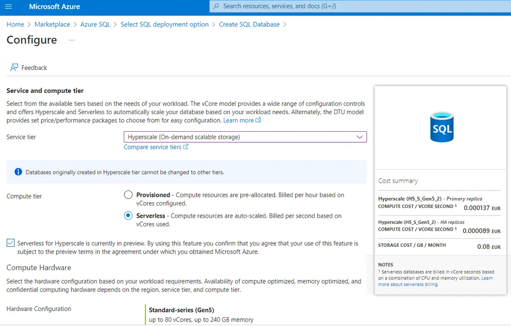 在“超大规模”层中选择无服务器选项的客户的优势在于,计算和存储都可以根据需要多达 80 个 vCore 和 100 TB 的数据库的工作负荷需求自动缩放。此外,自动缩放独立于主要副本、HA 副本、命名副本、CPU 和内存,以满足工作负载需求。
