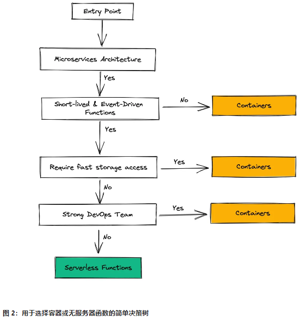 以下决策树可能有助于您决定是选择容器还是无服务器函数。