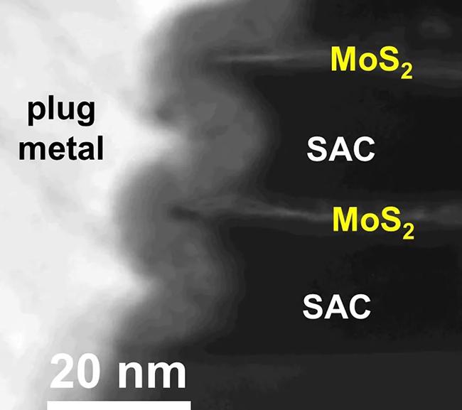 金属触点围绕 2D 半导体 (MoS2) 边缘成型,以形成低电阻连接