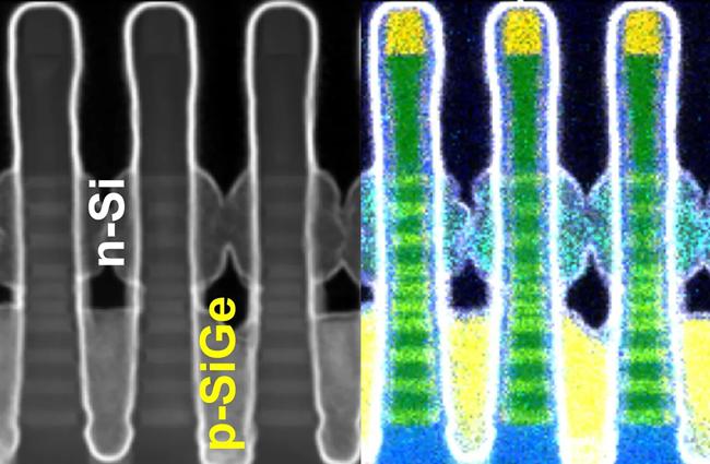 英特尔将详细介绍其使用互补 FET (CFET) 构建的逆变器电路。该电路由两个晶体管组成,一个位于另一个之上。这些条纹是纳米级的硅带