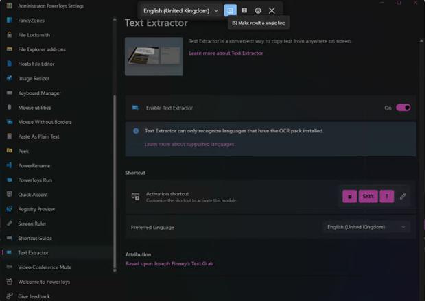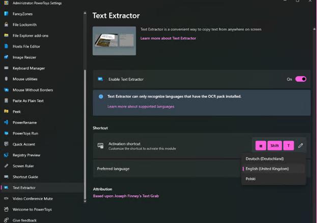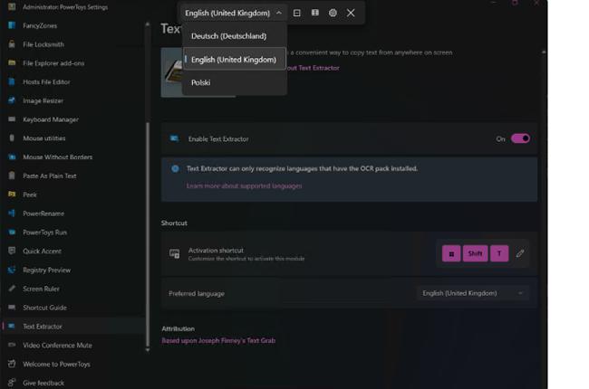 如果您的计算机上配置了多种语言,则必须决定默认情况下应使用哪一种文本提取器。该工具将优先使用系统语言 - 即您在 Windows 本身的菜单中看到的语言 - 但您可以将其更改为安装了 OCR(光学字符识别)包的另一种语言。在PowerToys 的文本提取器部分中,只需从首选语言下拉菜单中选择一种语言即可。