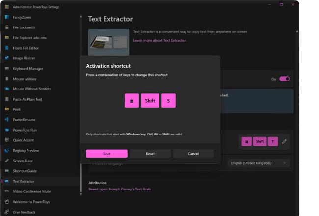 可以使用键盘快捷键激活文本提取器,默认情况下为Windows + Shift + T。如果您出于任何原因对此快捷方式不满意 - 例如,您可能发现同时按下这种特定的按键组合很尴尬 - 那么您可以将其更改为不同的东西。前往PowerToys 的文本提取器部分,然后单击激活快捷方式部分中的铅笔图标。按您想要使用的快捷方式,然后单击“保存”。