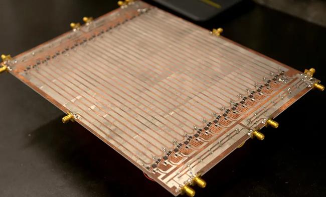 研究人员利用印在芯片上的 6 米长蜿蜒传输线实现了这种时间镜。他们连接了许多开关,每隔 20 厘米在传输线和地面之间连接一个电容器,距离比光的一个波长还要近。通过打开或关闭这些电容器,它们可以最快 3 纳秒改变材料的折射率。“突然之间,波浪感觉好像处于完全不同的介质中,”阿鲁说。