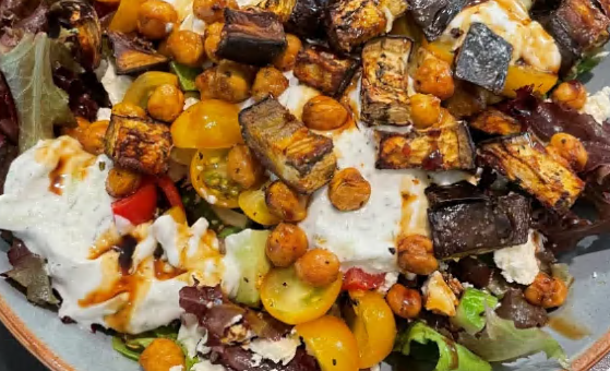 我称之为地中海碗,里面装满了绿叶蔬菜、烤鹰嘴豆和其他蔬菜,使这道菜成为美味的地中海减肥餐