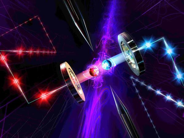 其中一个新的中继器拥有一对钙离子,该离子被捕获在用作两个量子存储器的离子阱中。当被紫色激光脉冲照射时,它们各自发射一个与其离子保持纠缠的光子。然后,另一个设备将这些光子中的每一个转换为1,550 纳米的电信波长光。然后一个光子沿着 25 公里长的光纤线轴发送到一个节点,而另一个光子则通过另一个线轴被引导到另一个节点。然后,中继器交换离子的纠缠数据,使光子及其节点在 50 公里的组合距离内发生纠缠。
