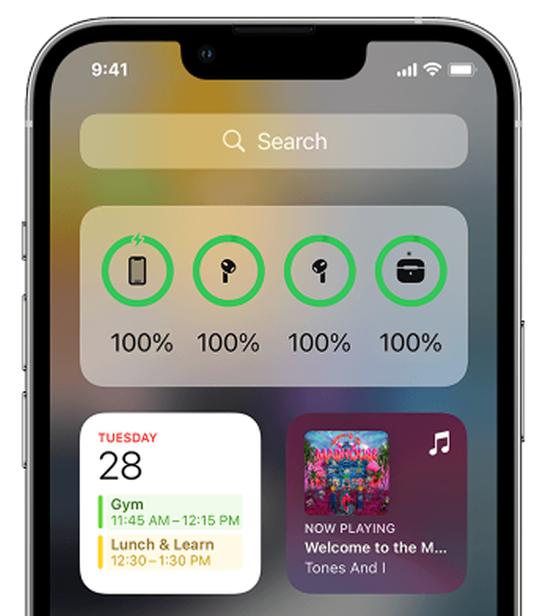 如果附近有 iPhone、iPad 或 iPod touch,您可以使用电池小部件轻松查看 AirPods 电池电量的准确百分比。为此,请在 AirPods 出现连接时检查电池小部件或电池电量。