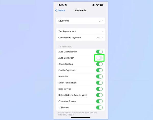 关闭自动更正。您会注意到其他有用的自动化设置(例如自动大写和预测)仍然处于打开状态,因此您仍然可以使用一系列方便的工具来帮助保持文本的良好顺序。