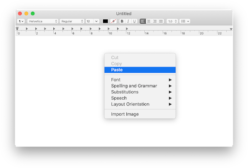 切换回空的 TextEdit 文档。右键单击文档中的任意空间,然后从上下文菜单中选择粘贴。或者,使用? + V键盘快捷键。