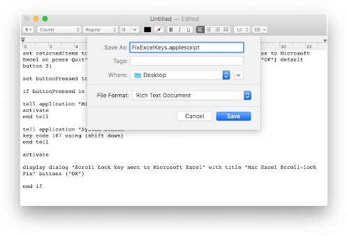 导航到文件>保存。或者使用? + S键盘快捷键。在“另存为 ”部分,键入“ FixExcelKeys.applescript ”(不带引号),然后将文档保存在桌面上。