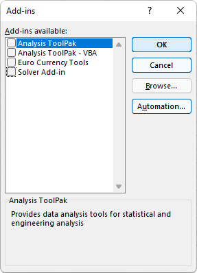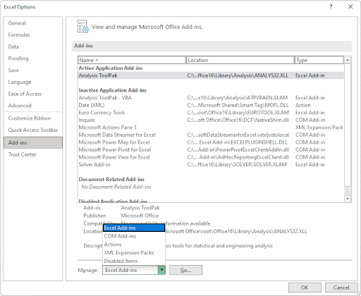 要禁用所有 Excel 加载项,请先取消选中“加载项”下拉菜单中每个选项旁边的复选框。然后单击“确定”并对“管理”上下文菜单中列出的每个项目重复此过程。