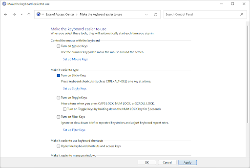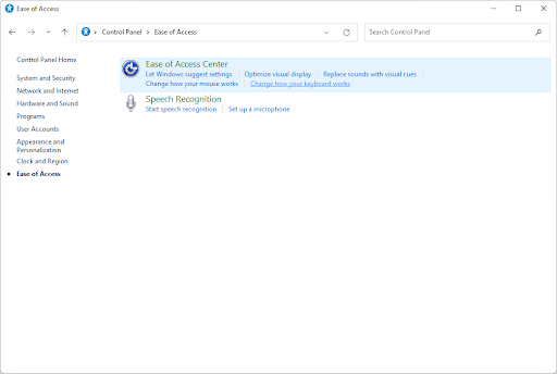 单击“更改键盘的工作方式”链接,该链接位于“轻松访问中心”类别下。您将被重定向到一个新页面。