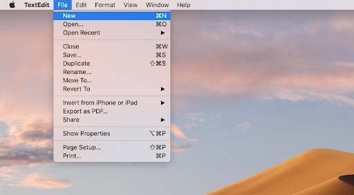 将 TextEdit 作为活动窗口,打开文件菜单,然后从上下文菜单中选择新建选项。通过这样做,您将创建一个新的文本文档。