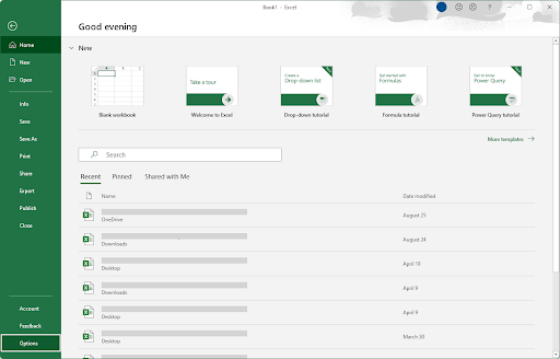 启动 Excel。您可以留在欢迎屏幕上。在这里,单击左侧窗格中的“选项”按钮。或者,如果您已经打开了一个工作簿,请导航至文件>选项。