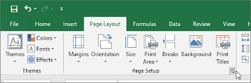 切换到功能区界面中的“页面布局”选项卡。单击“页面设置”部分角落的方块,如下图所示。