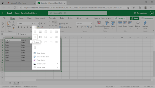 要自定义网格线,只需单击返回工作簿按钮并编辑单元格周围的边框。您可以编辑边框的颜色和样式。