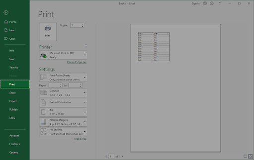 在Ribbon header界面,点击File菜单,然后切换到Print选项卡。在这里,单击“打印”按钮以查看工作表的预览。