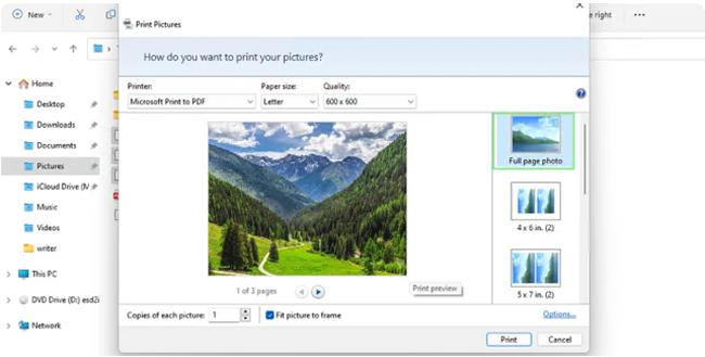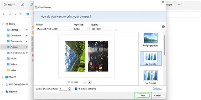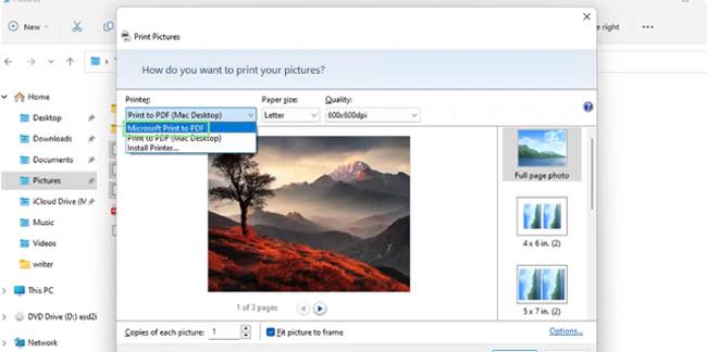 步骤 3. 选择 Microsoft Print to PDF:在“打印图片”对话框中,单击“打印机”下拉菜单,然后选择“Microsoft Print to PDF”作为您的打印机。