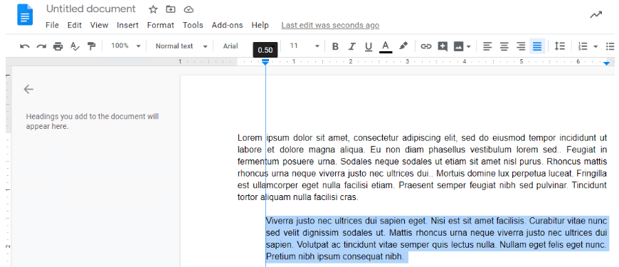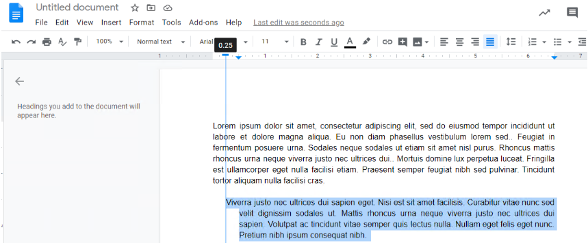 单击左缩进(蓝色三角形)并将其向右拖动到您希望缩进文本的位置。第一行缩进(蓝色矩形)将与左缩进一起移动