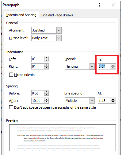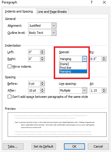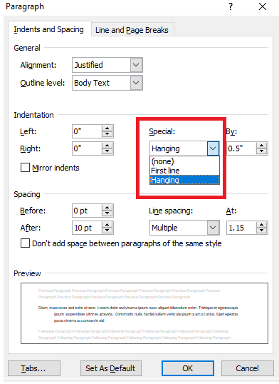 查找Indentation部分并从Special下拉列表中选择Hanging 。