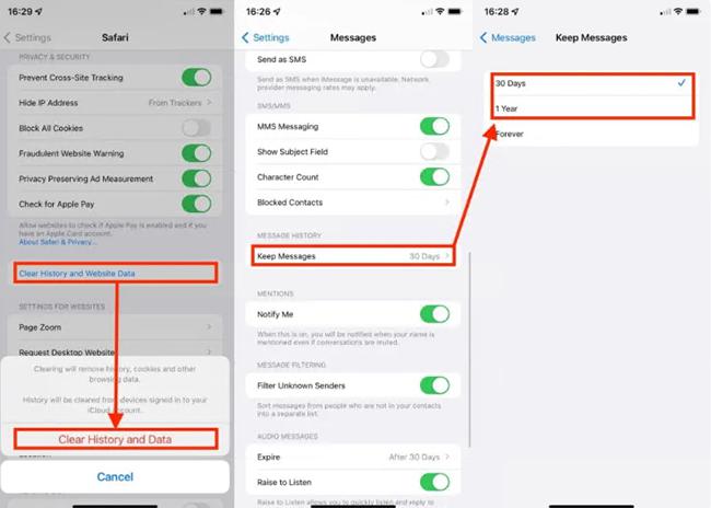 对于消息,这可能很简单,只需打开“设置”,然后点击“消息”,向下滚动到“消息历史记录”,然后将“保留消息”的时间从“永久”更改为较低的数字,例如一年或 30 天。