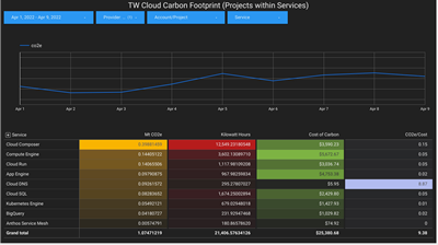 在 Thoughtworks 的一个集中团队能够使用云计费数据使用 CCF 数据后,内部团队可以广泛使用仪表板,以便他们可以查看和监控他们的历史和日常云排放量指标。这种新发现的透明度和对实时数据的访问使团队能够识别尖峰和趋势,并自动生成重复排放报告,以通知团队他们需要采取的任何补救措施。