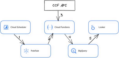 Cloud Scheduler 每天触发一条 Pub/Sub 消息。该消息由 Cloud Functions 使用,它通过查询一天的数据量来访问 CCF API。此函数将此数据向上游推送,将其附加到 BigQuery 表。然后,该表由 Looker Studio 使用,并与许多不同可视化的计费导出数据相结合。
